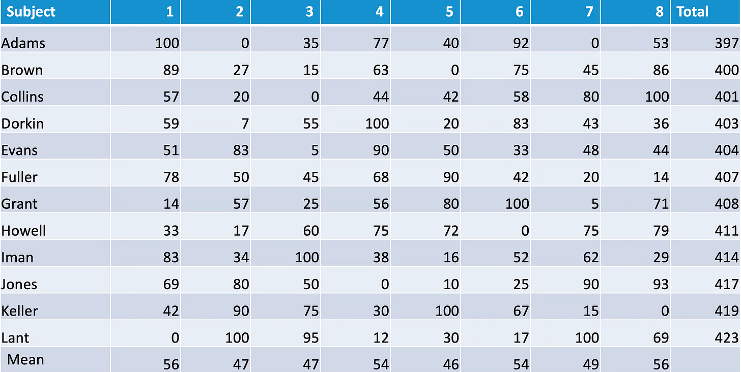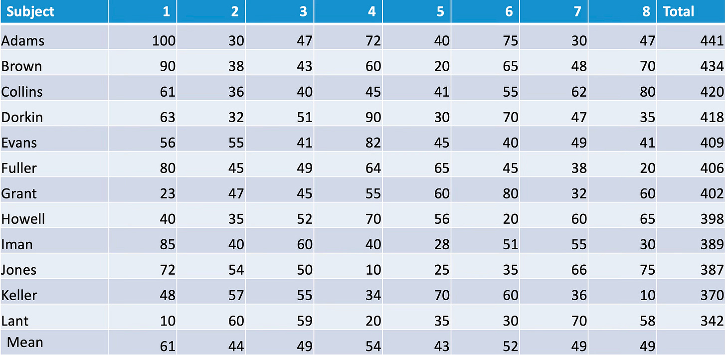 If we have a group of 12 students, and have their percentage scores on 8 subjects, it might seem easy to work out who is the best students. We just add up the scores on each of the 8 subjects, and see who has the highest total: