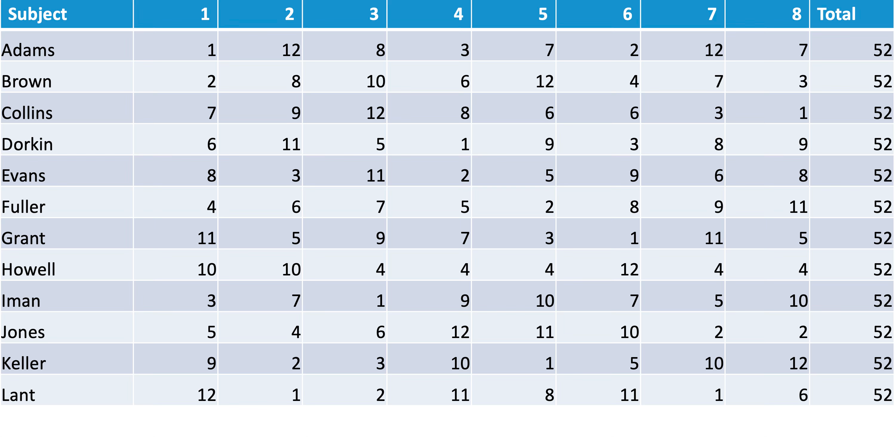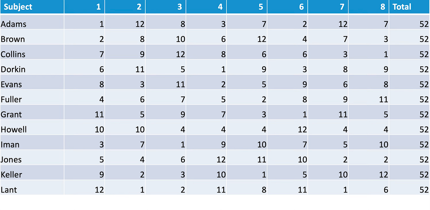 However, there is a problem here. Subject 1 used most of the mark range, with scores ranging from 10 to 100, while others, such as subject 3, have scores ranging only from 40 to 60. To control for this, we could replace scores with class ranks, giving the highest scoring student in each subject a rank of 1, and the lowest scoring student a rank of 12: